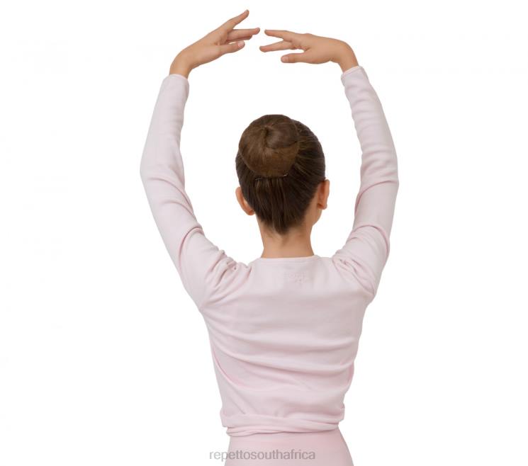 Pale pink wrap-over top with long sleeves for young dancer. Ideal for warming-up. Warming-up is an essential step for all dancers, regardless of their level in dance, our warm-up items are comfortable and offer excellent thermal protection. Drawstrings to knot on side, V-neck.